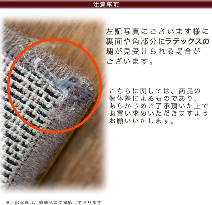 【輸入カーペットを安心してご利用いただくためのお願い】 ●輸入ラグに関して ※同じ商品でも製造ロットの違いによって、サイズや、色味、柄模様の左右が反転していたり、位置がズレている場合がございます。ただし、現地の工場や倉庫での検品をクリアした商品を輸入しています。あらかじめご了承くださいませ。/ ●においに関して ※ご使用当初、裏面に塗られる仕上げの接着塗料(ラテックス剤)のにおいがする場合がございます。人体への影響はありませんが、においに敏感の方や、ご心配の方はご理解の上ご購入お願いいたします。開封後常温のもとで気化(蒸発)するため、においはご使用につれてなくなります。気になる場合は風通しの良いところで陰干ししていただきますと、より早く解消されます。/ ●サイズに関して ※カーペットの製法上、表示サイズより0~3%の誤差がございます。/ ※いずれも商品の初期不良ではございませんので返品・交換は行なっておりません。(※お客様で返品の送料ご負担によるキャンセルは、返品規定に基づきお受けさせていただきます。)/ ※裏面の製品シールは剥がさないでご使用ください。