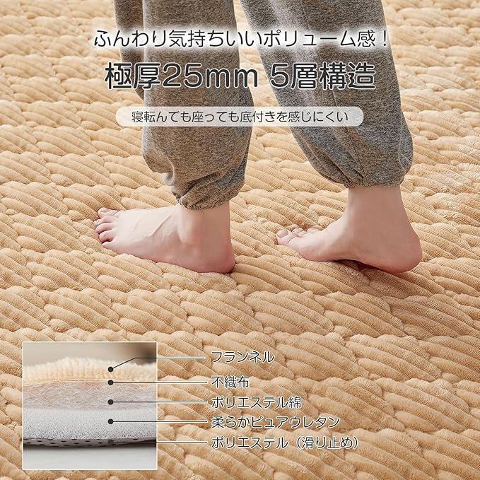 CHOSHOME カーペット ラグ 極厚25mm ラグマット 1.5畳 絨毯 厚手 オールシーズン 滑り止め 防音 ふわっと手触り 北欧 あったか 洗える フランネル 床暖房 ホットカーペット対応 こたつ敷きマット 無地 防ダニ 防臭 130 190cm ダークベージュ
