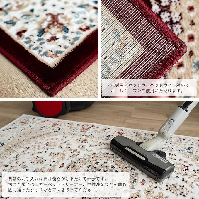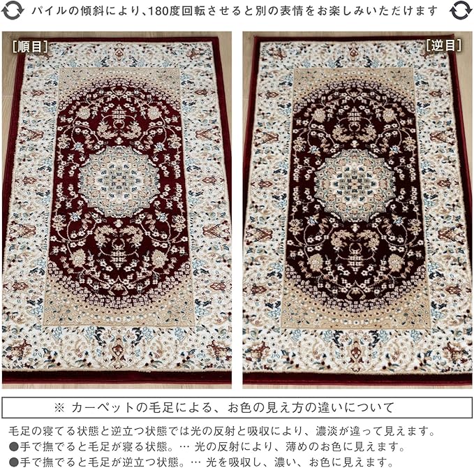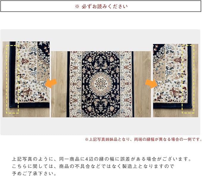 【輸入カーペットを安心してご利用いただくためのお願い】 ●輸入ラグに関して ※同じ商品でも製造ロットの違いによって、サイズや、色味、柄模様の左右が反転していたり、位置がズレている場合がございます。ただし、現地の工場や倉庫での検品をクリアした商品を輸入しています。あらかじめご了承くださいませ。/ ●においに関して ※ご使用当初、裏面に塗られる仕上げの接着塗料(ラテックス剤)のにおいがする場合がございます。人体への影響はありませんが、においに敏感の方や、ご心配の方はご理解の上ご購入お願いいたします。開封後常温のもとで気化(蒸発)するため、においはご使用につれてなくなります。気になる場合は風通しの良いところで陰干ししていただきますと、より早く解消されます。/ ●サイズに関して ※カーペットの製法上、表示サイズより0~3%の誤差がございます。/ ※いずれも商品の初期不良ではございませんので返品・交換は行なっておりません。(※お客様で返品の送料ご負担によるキャンセルは、返品規定に基づきお受けさせていただきます。)/ ※裏面の製品シールは剥がさないでご使用ください。
