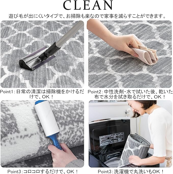 【お手入れ便利】毛足がないので、ゴミが絡みにくく、日常の清潔は粘着クリーナーをコロコロするや掃除機をか けるだけでキレイになります。また、汚れた場合は手洗いや洗濯ネットに入れて洗濯機で洗うことができます(ご 注意:風通しの良いところで陰干しし、アイロン、乾燥機の使用をお避け下さい。)