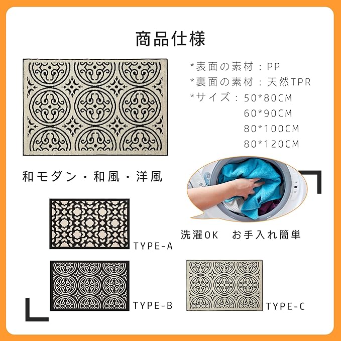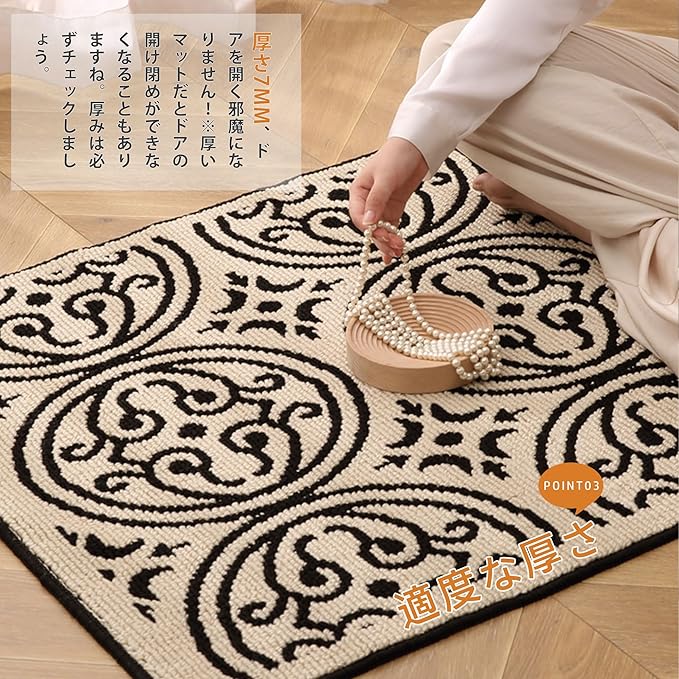【耐久性・耐摩耗性 適度な厚さ】細かい縫い目きれいな編み方で作られており、優れた耐久性と耐摩耗性を持ちます。厚さ7mm、ドアを開く邪魔になりません。※厚いマットだとドアの開け閉めができなくなることもありますね。厚みは必ずチェックしましょう。50*80cm、60*90cm、80*100cm、80*120cmの4サイズから選べます