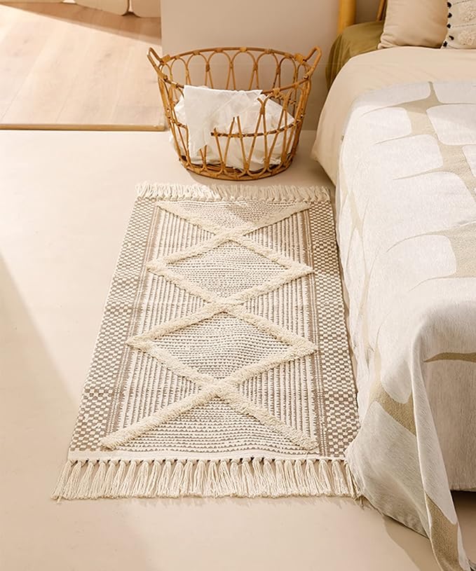 ナチュラルなベージュのフリンジマット。 木製の家具と相性がよさそうな色合いで、主張せずにお洒落にお部屋を着飾ります。 玄関だけでなく、寝室、キッチンなどいろんな場所におくだけでお洒落になります。