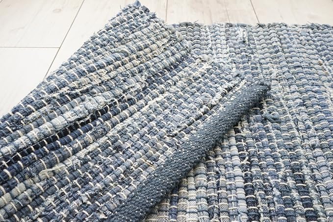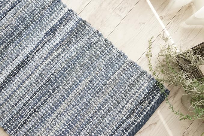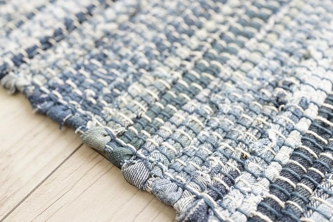 サヤンサヤン 洗える 手織り 玄関マット 室内 デニムラグ 70x120 ブルー 平織り インド