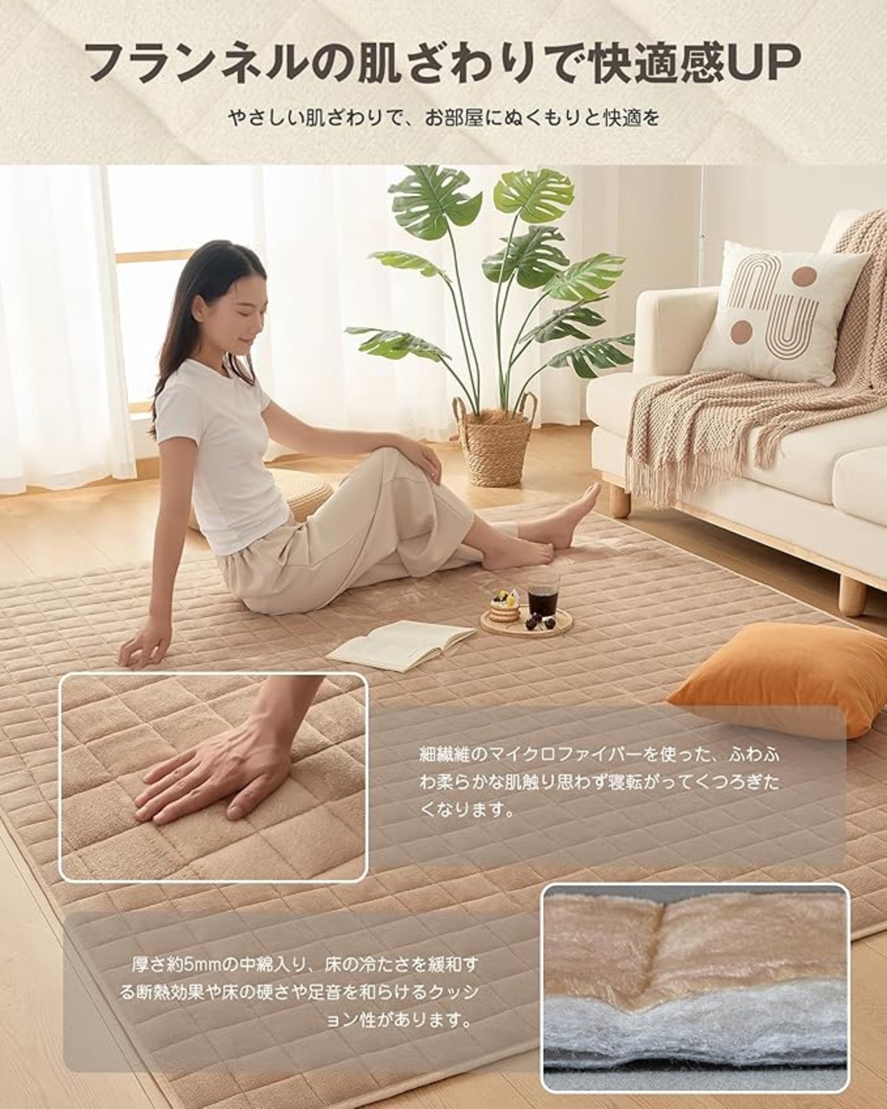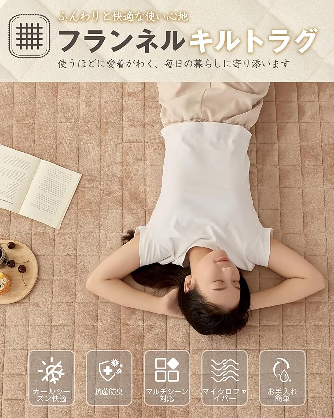 【掃除も楽々】毛足が短いのでゴミが絡まる心配も少なく、掃除機や粘着テープでサッとお掃除が可能です。ご家庭の洗濯機でまるっと洗えてお手入れ簡単です。フランネルキルトラグは軽く取り扱いが簡単、移動や収納も楽々です。