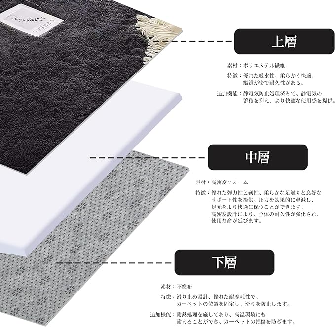 【厚手設計】①毛足の長さ:約40mm ②ポリウレタンの厚さ:約15mm(一般的な製品よりも厚め)③裏地:滑り止め付き不織布。優れた弾力性で防音効果も抜群です。