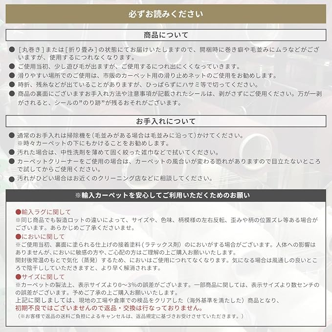【輸入カーペットを安心してご利用いただくためのお願い】 ●輸入ラグに関して ※同じ商品でも製造ロットの違いによって、サイズや、色味、柄模様の左右が反転していたり、位置がズレている場合がございます。ただし、現地の工場や倉庫での検品をクリアした商品を輸入しています。あらかじめご了承くださいませ。/ ●においに関して ※ご使用当初、裏面に塗られる仕上げの接着塗料(ラテックス剤)のにおいがする場合がございます。人体への影響はありませんが、においに敏感の方や、ご心配の方はご理解の上ご購入お願いいたします。開封後常温のもとで気化(蒸発)するため、においはご使用につれてなくなります。気になる場合は風通しの良いところで陰干ししていただきますと、より早く解消されます。/ ●サイズに関して ※カーペットの製法上、表示サイズより0~3%の誤差がございます。/ ※いずれも商品の初期不良ではございませんので返品・交換は行なっておりません。(※お客様で返品の送料ご負担によるキャンセルは、返品規定に基づきお受けさせていただきます。)