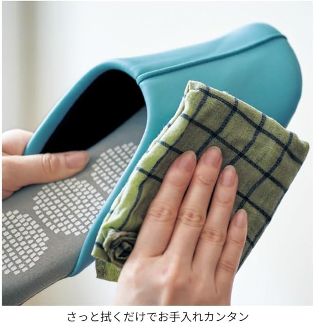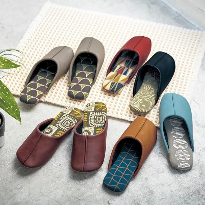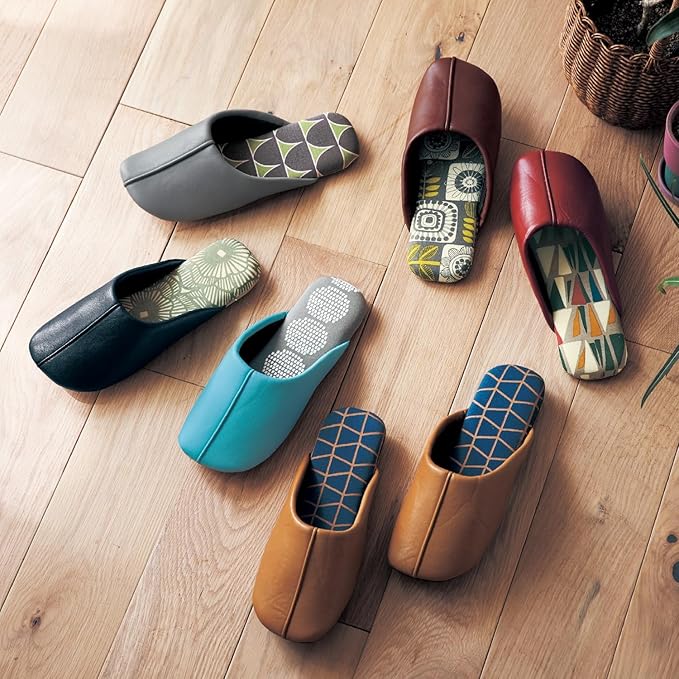 クールに見えて、中は個性的 【甲部分のポイント】 ●高級感があるデザイン ●汚れてもさっと拭き取れる合皮素材 ●甲の中心のつまみもポイント ●甲が合皮でさっと拭いてお手入れでき、トイレ用のスリッパとしてもおしゃれ ●裏はすべりにくい素材です ●内側は大胆な幾何柄ファブリックを使ったメリハリのあるデザイン ●全体に細めのすっきりしたデザインです ●色違いを揃えて並べても面白い ●家族で色を決めて揃えるのもおすすめ ベルメゾンのおしゃれなスリッパ