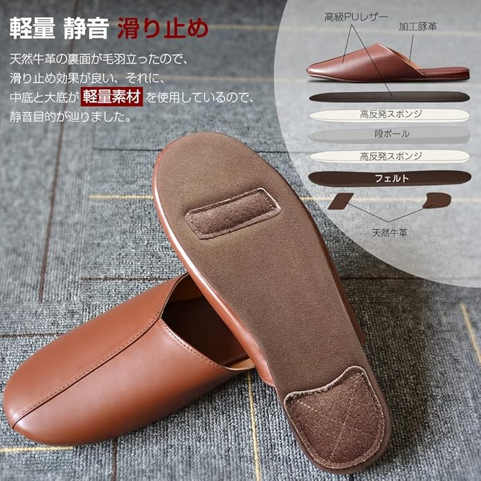 【静音 滑り止め】スリッパのアッパー部分がスリッパ全長の4分の3になったので、歩いていても脱げにくく、パタパタ音もなく、静音目的を実現した。妊娠方や高齢者へのこだわりに、スリッパの底面に前後2箇所に天然牛革の滑り止め加工も施した。