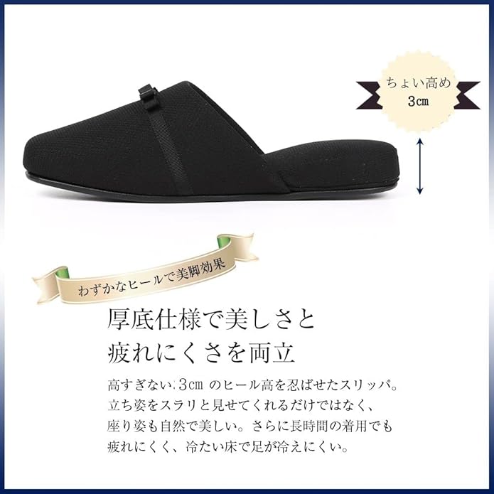 【しっかりした作り】縫製も1点ずつ丁寧に作成し、美しい仕上がりを追求しています。 甲のあたる部分やかかとにクッション性があり、ヒールは足が疲れにくい3cm!裏面はレザー製なので、雨に濡れた廊下などでも安心です。