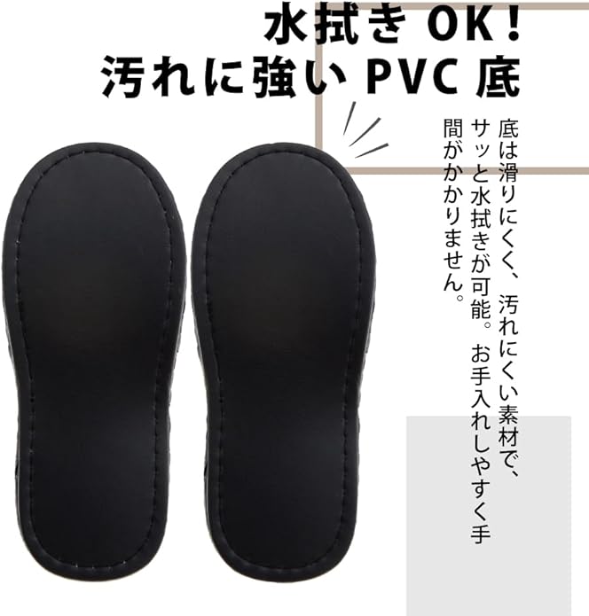 【汚れをサッとふけるPVC底】汚れている床を歩いても、スリッパが汚れにくくサッと水拭きも可能です。お手入れに手間がかからないのも、うれしいポイント。