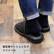 【低反発入りインソールを使用】主に寝具に使用されている低反発素材をインソールに使用。圧力や衝撃の吸収・分散に優れており、力がかかるとゆっくりと沈み、ゆっくりと戻って負担を和らげます。※材質の特性上、冬場は固くなります。