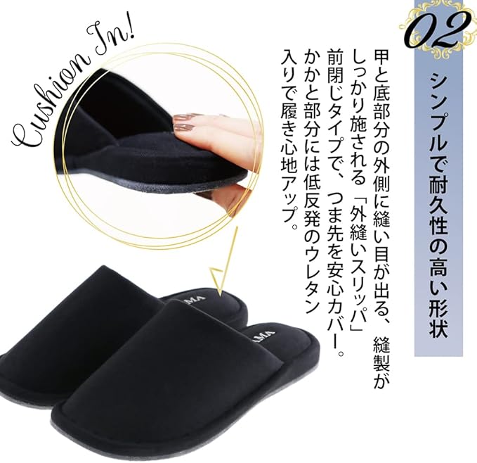 【シンプルで耐久性の高い形状】甲と底部分の外側に縫い目が出る、縫製がしっかり施される外縫いスリッパ。 かかと部分には低反発のウレタン入りで長く履き続けることができます。