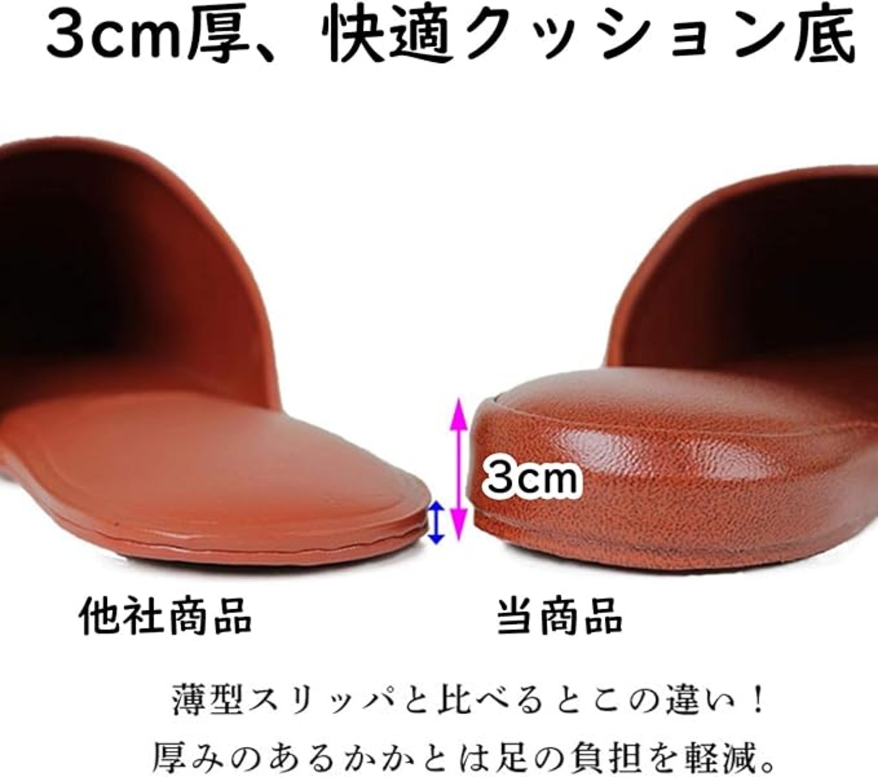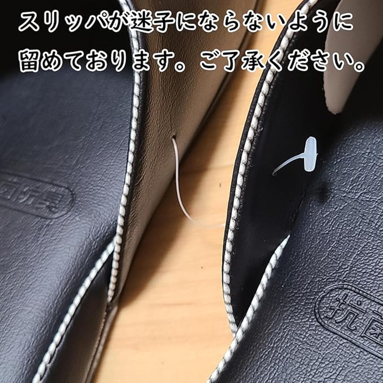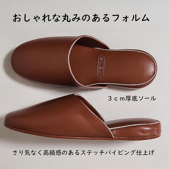 きれいな丸いフォルム。足の負担を軽減する3cm厚みのあるカカト部。高級感があるフェイクレザーを使用。高周波着圧式の最新の技術でしっかりとした作り。来客・来賓用に最適なスリッパ。