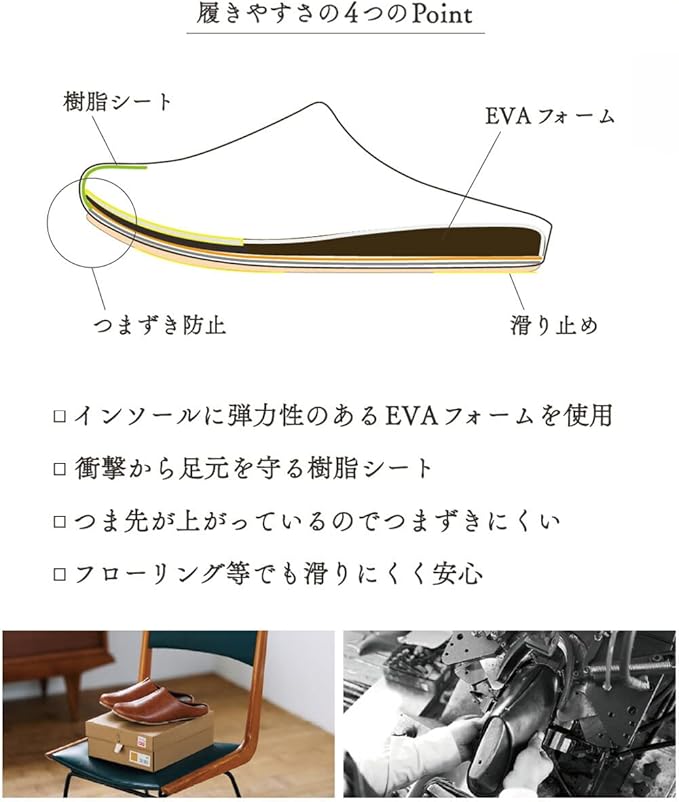 【商品について】 室内を”歩く”ことを考えて靴屋さんが丁寧に作ったスリッパ。 靴の製法を用いているため、しっかりとした形状で脱ぎ履きがスムーズ。 つま先が上がっているので、つまずきにくく転倒防止にも繋がります。