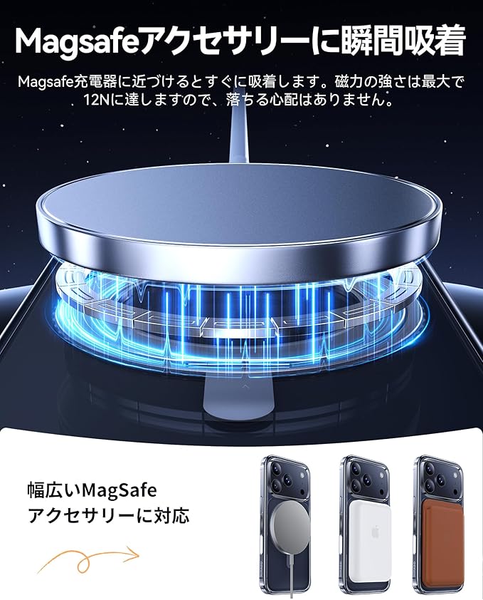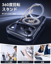 特徴 magsafe対応、360 回転スタンド、縦横両対応、指紋防止、透明、米軍規格取得、耐衝撃クーション、バンパー、黄ばみ防止、ストラップホール付き