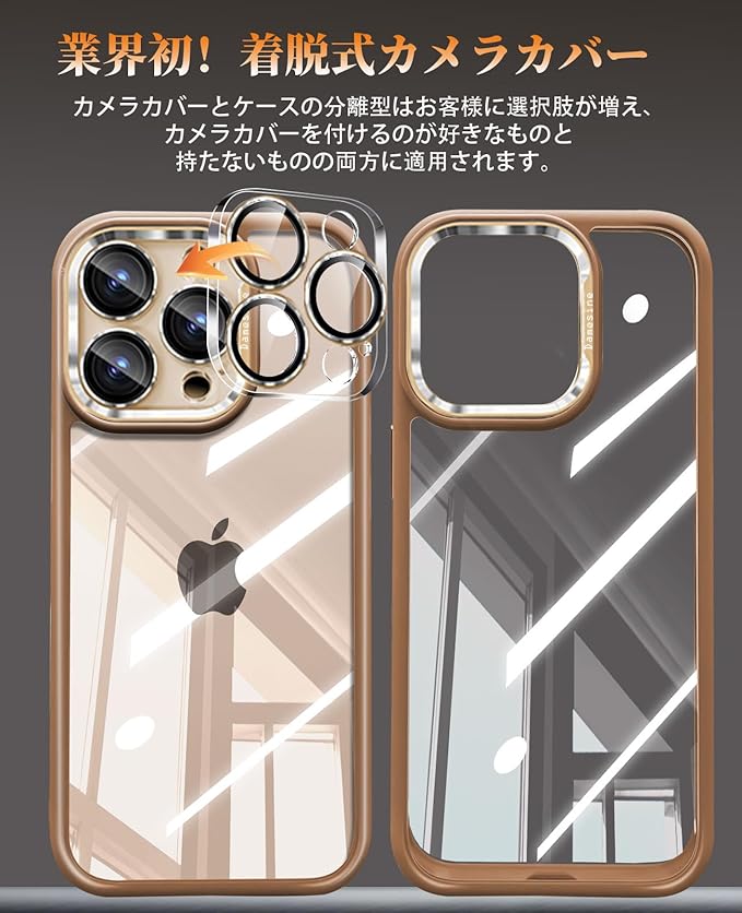 【着脱式カメラレンズ保護カバー】 自社開発の分離型カメラカバー設計で、好みに応じて着脱が可能。高硬度超高透光ガラスフィルムを使用し、写真/動画撮影に影響ゼロ。カメラフレームの縁のきらめく精密カット加工が高級感を演出、iPhoneをより御洒落になる。マイク部分のステンレス防塵メッシュなど細部までこだわりました。