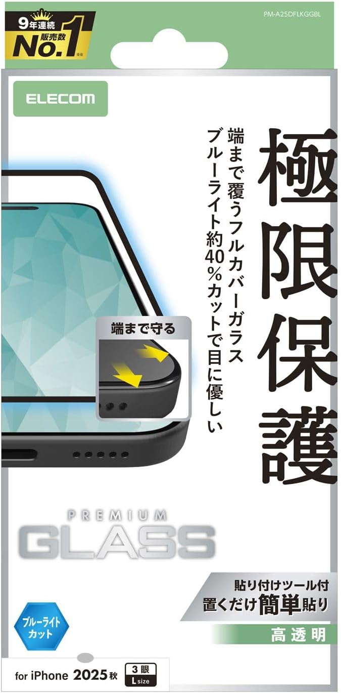 エレコム iPhone 17 Pro Max ガラスフィルム 光沢 強化ガラス 硬度10H ブルーライトカット カバー率99% 全面保護 極み設計 指紋がつかない 気泡が入らない 【貼り付けツール付き】 PM-A25DFLKGGBL
