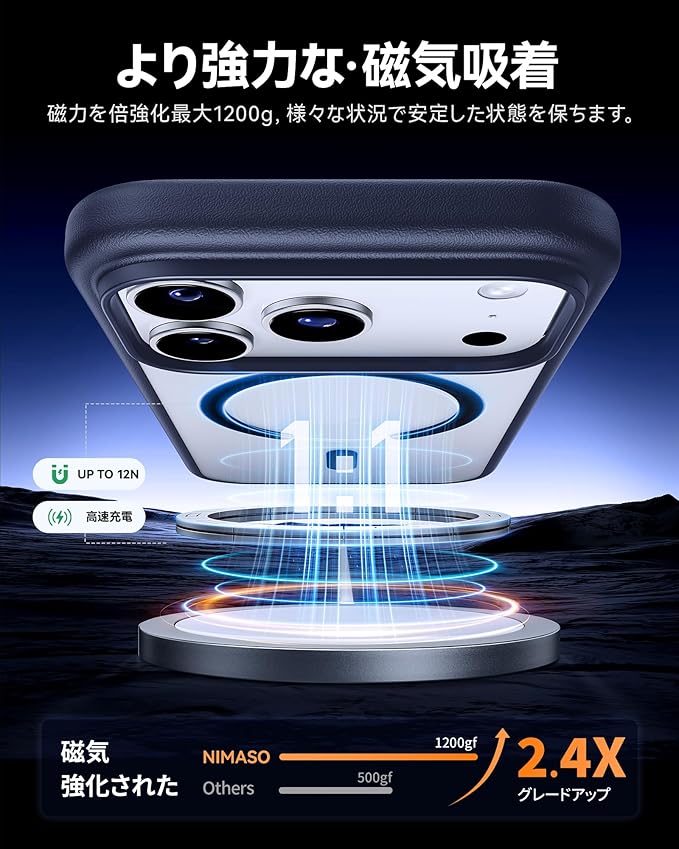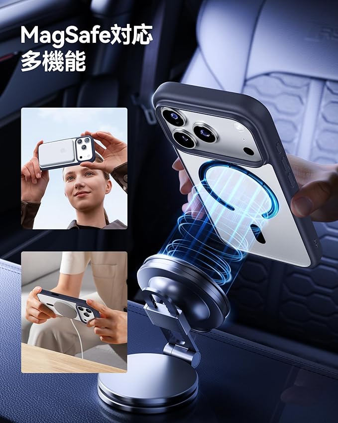 【強力な磁力吸着・高速充電】強力なマグネットが内蔵されており、差し込みのいらない超簡単充電を実現。マグネット部分は位置が正確に合致しており、ワイヤレス充電がこれまでよりもすばやく簡単に完了します。あいふぉん17 Proを充電する時は、ケースを装着したままMagSafe充電器に取り付けるか、Qi規格の充電器の上に置くだけです。