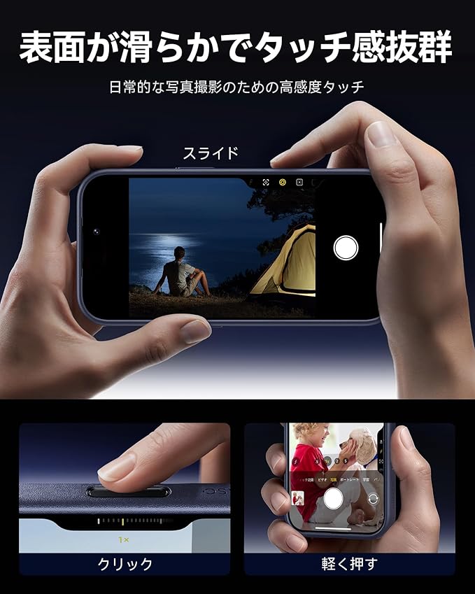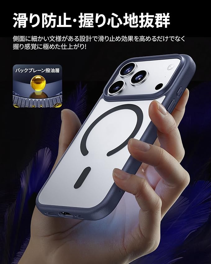 【半透明・マット仕上げ】背面は耐久性や耐摩耗性に優れたポリカーボネート使用。表面には指紋防止ナノコーティングを施しており、指紋がつく心配もありません。マットな質感でサラサラした触り心地。背面は半透明なので、リンゴマークが透けて見えるようになっています。高級感も併せ持ったケースです。また、いPhone 17 Proケースはカメラコントロールカバー付き。iPhone17シリーズからのカメラコントロールボタンに対応しています。