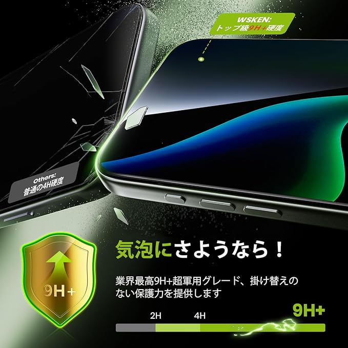 【9H硬度強化・飛散防止】対応 いphone17 pro max 保護フィルムは画面に全面保護を提供します。航空宇宙や軍事分野で広く使用されている業界最先端の 9H+ 強化ガラスを採用し、4.5時間以上の高温クエンチ処理を受け、通常のガラスよりも5倍高い125MPaの圧強度を持っています。 衝撃性と耐摩耗性に優れ、落下や衝撃を恐れない。しかも衝撃を抑えるシリコンコーティングを内蔵し、画面の破損を最低限まで抑え、すり傷防止や指紋防止をしながらiPhoneを最大限に守ります。鍵やコインなどの鋭利な物と一緒にカバンに入れて猛烈に揺れても傷がつきません。万が一割れた時も飛散防止加工により怪我を効果的に防ぎ、使用者の安全を確保します。