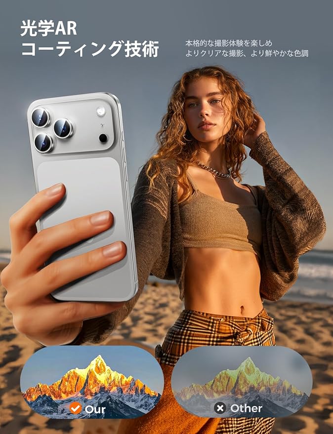 【高透過率99.9%】AR高透過技術を採用し、カメラ本来の高画質をキープ。黒縁を取ることにより、露出オーバーが防止でき、より綺麗な写真や動画を撮影することが可能。