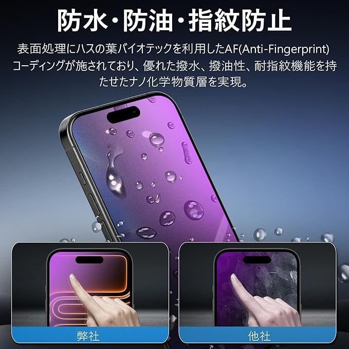 【アンチグレア・指紋防止・高感度タッチ】アンチグレア(非光沢)タイプのさらさらで快適な操作感。光の反射を軽減し、より目に優しくちらつきを抑えます。また、長時間のスマートフォン画面の使用でも目の疲れを軽減することができます。同時に、iPhone17Promax用ガラスフィルムには撥油コーティングが施されており、指紋や汚れなどに強くなめらかな操作感を実現、付着した汚れなどは簡単に拭きとれます。こちらは高耐久撥油コーティングが施され、つるつるな滑り感を実現!ゲームをする人におすすめです。