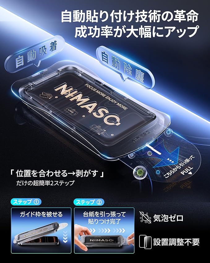 「簡単貼付け・自動除塵」: NIMASO最新型の自動除塵ガイド枠付き!ガイド枠を装着し、リリースフィルムを引くだけの2ステップで、初めての方でも簡単・確実に貼付け可能。静電気を利用した自動除塵機能で貼り付け時のホコリを除去し、気泡の発生を大幅に抑制。完璧な貼り付けをサポートします。