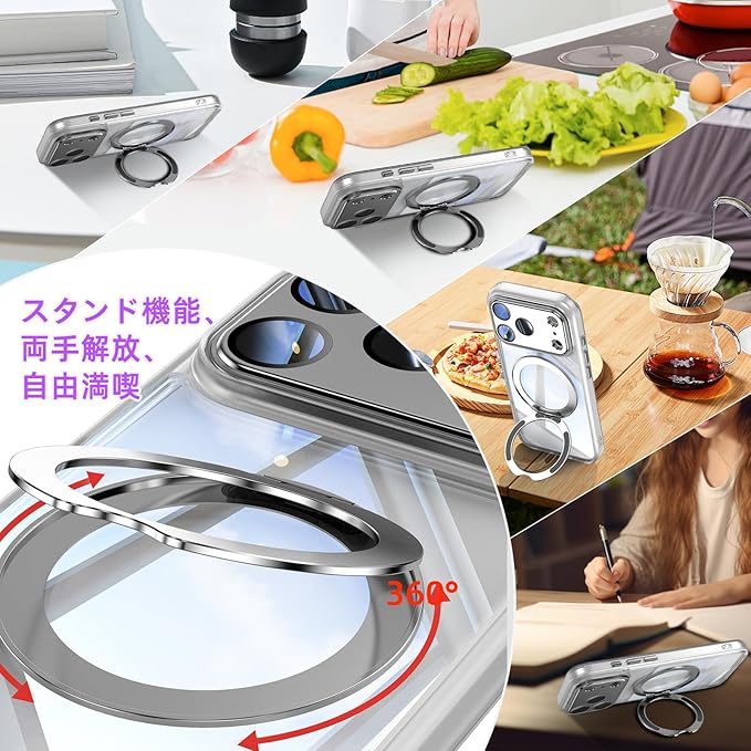 [スタンド機能、両手解放、自由満喫] 多機能マジックスタンドは、折りたたんでグルーブに隠して収納させることができます。便利な隠れスタンドはケースと一体型になり、絶妙なデザインで携帯を自由に多角度を調節でき、力よくスマホを支えて。後ろに付いているフィンガーリングはスタンド機能はもちろん、滑りにくくて持ちやすい、安定的なグリップが特徴です。360度回転可能、120角度調節可能なので、縦置き、横置きに端末を立てかけて、好きな角度で動画視聴、読書、WEBなどに便利です。使わない時はスマートに収めるから邪魔にならない。