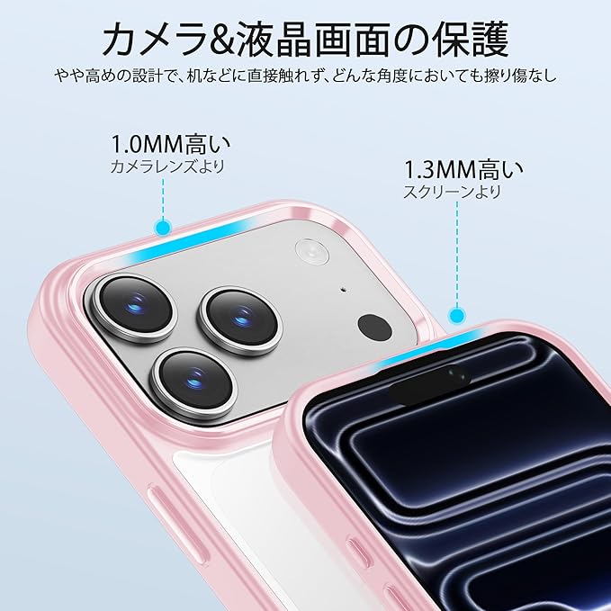 【絶妙バランス・快適操作】アイホン17proボタンやレンズなどの細部に基づいて設計された専用スマホケースは、ぴったりとフィットしています。それぞれのボタンと充電口が正確で精密設計により、スマホケースをつけていないかのように快適に使用できます。スマホカバーの縁はスマホの画面とカメラレンズより1mm高く、保護ガラスフィルムを貼った状態で平置きしても画面が接触しません。細部までの保護しており、安心感は抜群です。