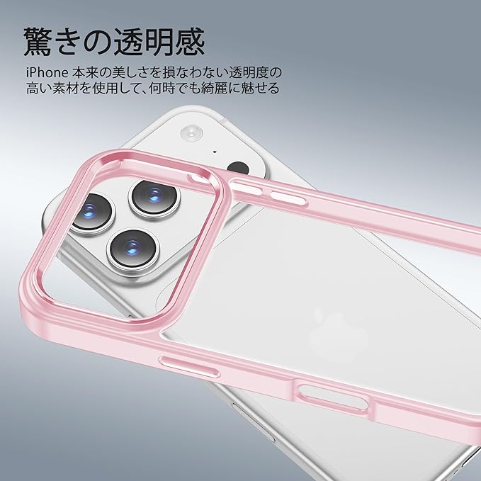 【透明度が高い】背面は高透明度と指紋軽減を両立したポリカーボネート素材を採用、光透過率は99%、透き通った高い透明度を誇り、アイフォン17pro本来の美しさをそのままに楽しめます。高精度表面処理また最新の黄変防止技術を使用することで、あいほん17プロケースを長時間使用しても鮮明で透明性を保ち、日常使用時の指紋や油汚れなどによる損失を軽減することができます。いつものスマホに上品さをプラス。