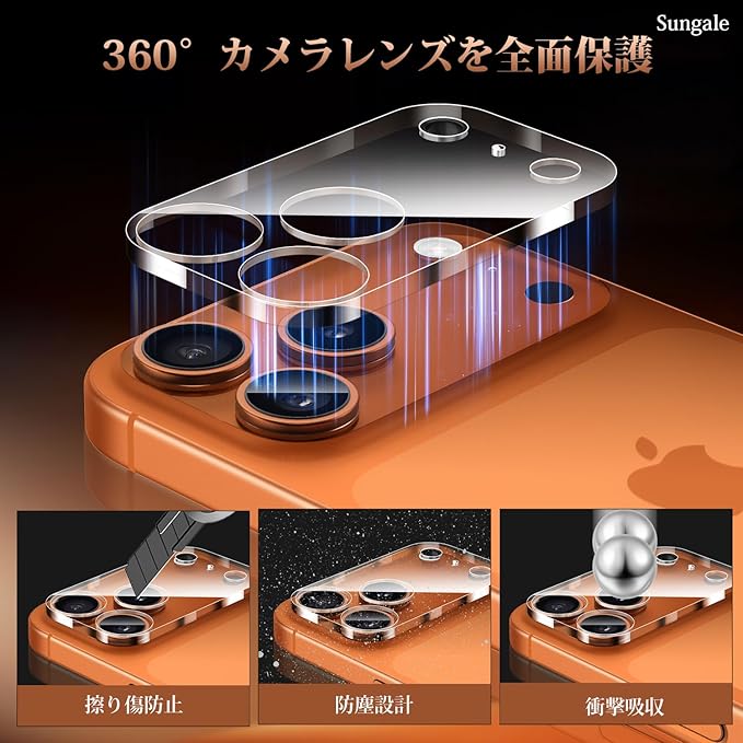 Sungale いPhone17Pro カメラ保護 カメラフィルム iPhone17 Pro カメラ保護 カバー 强化ガラス 黒縁取り 極薄 アイフォン17プロ用カメラレンズ保護カバー 全面保護 3眼レンズ保護 露出オーバー防止 防塵 旭硝子素材製iPhone 17 Pro 対応 カメラフィルム (2枚セット)