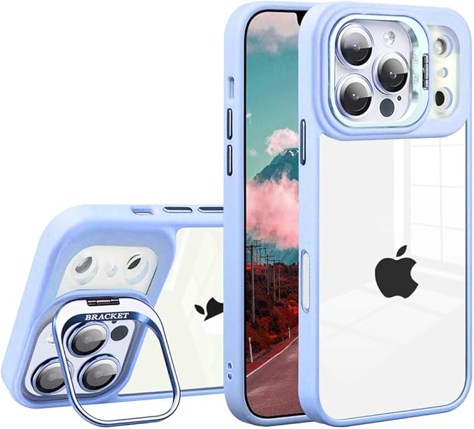 スマホケース 対応 iPhone 17 Pro Max クリアケース 透明 レンズスタンド付き スタンド機能 レンズカバー付き PC背面+TPUバンパー おしゃれ 耐衝撃 ストラップホール付き アイフォン17プロマックス携帯電話ケース (ブルー, 17 Pro Max)