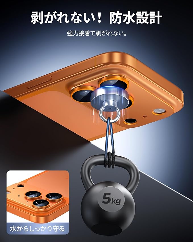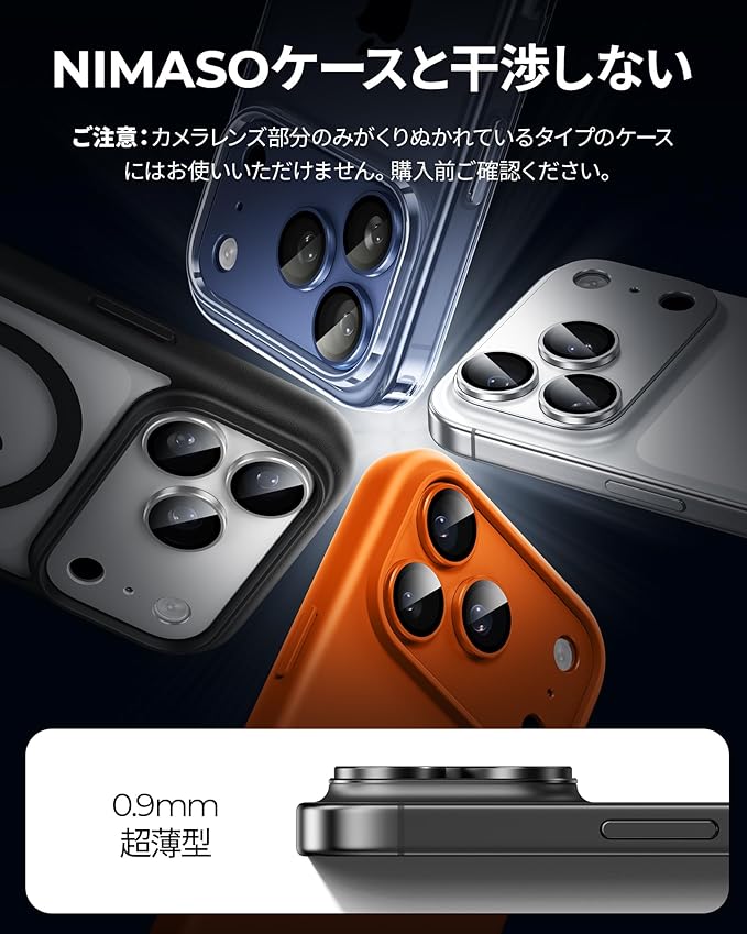 【対応機種】iPhone 17 pro max専用(三眼レフ) ご注意:iPhone 17 pro max カメラレンズの周囲まで覆うタイプのケースにはお使いいただけません。またiPhone純正ケースには対応しないので、予めご了承ください。さらに、iPhone 17promax 用レンズカバーは粘着力が強化されており、粘着面が広くなり、剥がしにくくなっています。剥がす必要がある場合は、レンズに近い2つの角からゆっくりと剥がしてください。