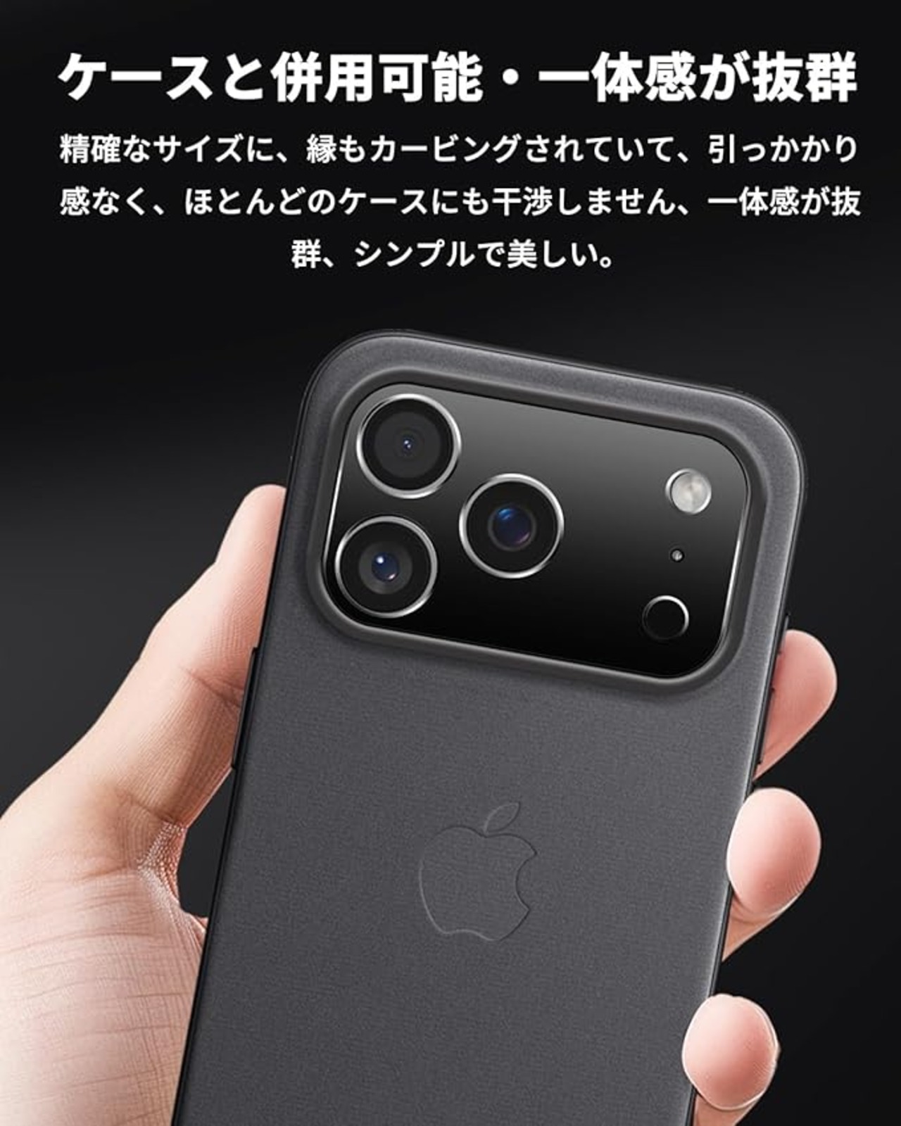 【アルミ合金一体感】アルミ合金素材を採用して、ガラス製カメラフィルムより軽い上に割れることもなく、指紋も付きにくいです。さらにアルマイト処理が施されているので、耐摩耗性にも優れています。縁部分も含め、精確なサイズにカービングされているので引っかかる感じがなく、ほとんどのケースとも干渉しません。 本体のレンズ部分と完全に融合し、違和感がなく、一体感と高級感に満ちています。