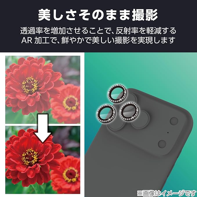 端末のカメラレンズを傷や汚れから守るリアルガラスを採用し、周囲にラインストーンで装飾したカメラレンズ保護ガラスフィルムです。