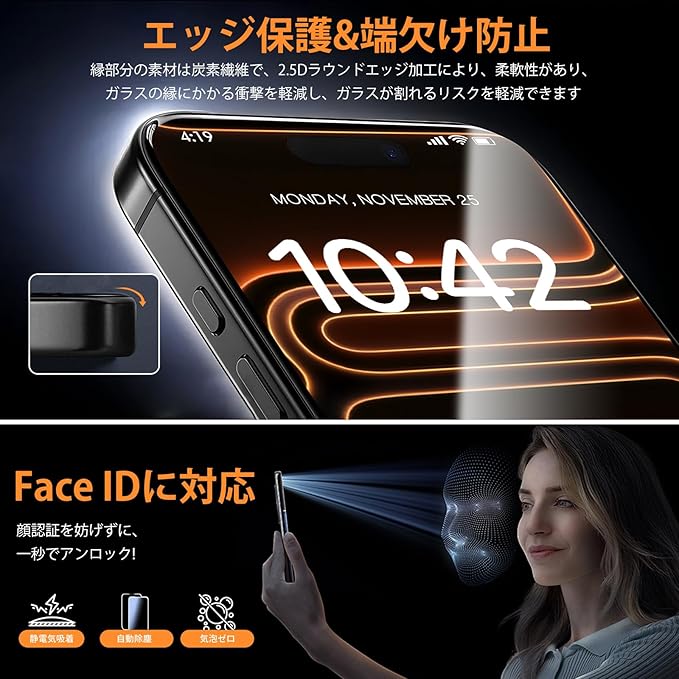 【10H硬度・飛散防止】対応 アイフォン 17 プロマックス ガラスフィルムは10H硬度の強化ガラスを採用。ナイフや鍵などの鋭利な物品と接触しても傷つきにくく、画面を強力に守ります。また、スマホ画面保護フィルムは特殊な飛散防止設計により、万が一割れても破片が飛散せず、安全性が極めて高いのも特長です。スマホの画面保護とユーザーの安全を両立しました。