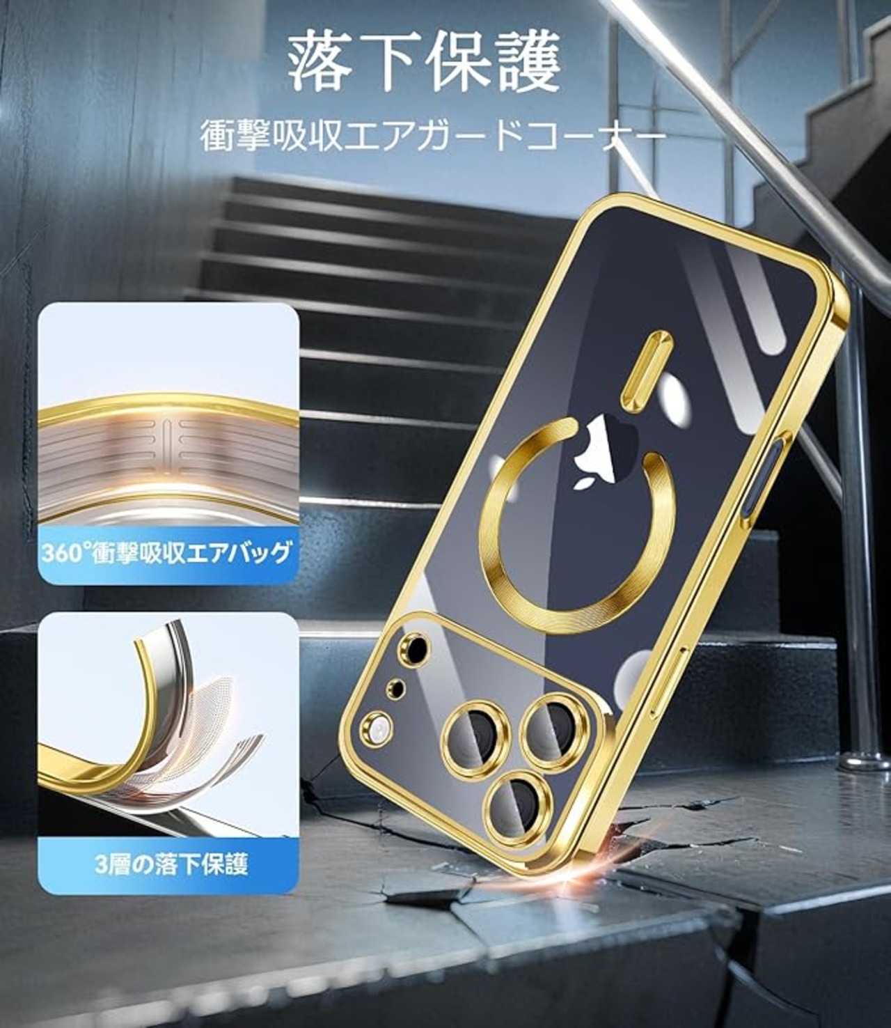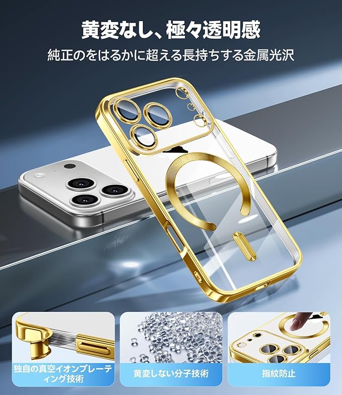 iPhone 17 Pro 専用 ケース カバー クリア 1枚ガラスフィルム付き TPU MagSafe対応 ワイヤレス充電対応 マグネット搭載 耐衝撃 アイフォン17pro カバー 自動吸着 高透過率 全面保護 指紋防止(ゴールド)