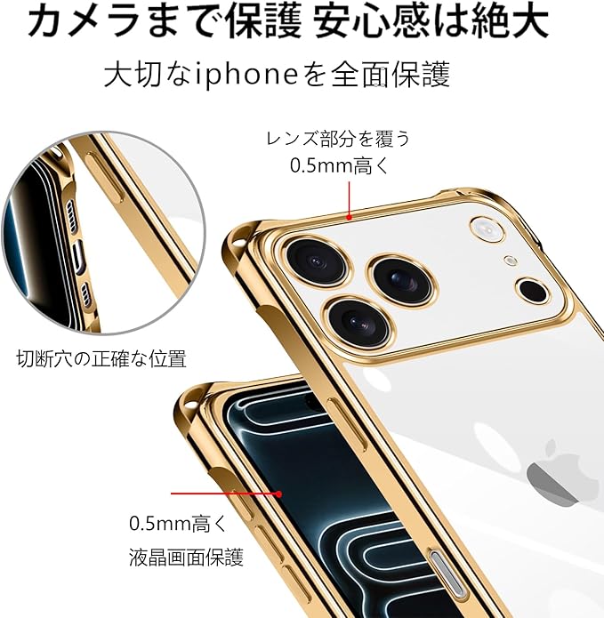 【カメラレンズ保護 & ディスプレイ保護】カメラはオールインクルーシブ保護設計を採用しており、精密な突起が大切なカメラを保護します。レンズ保護フィルムを取り付ける必要はありません。4つのバンパーには、背面に突起があります。iPhone 17 pro/アイフォン17 pro のカメラレンズより1.5ミリ高い立ち上がって、有効的に擦り傷を防ぎます。液晶画面より約1.5mm高く設計され地面と接触するのを防止、外部との擦り傷を避けるし、精確なホールデザインは携帯にもジャストフィツトしていて、すべてのポートとボタンも押しやすくなります。