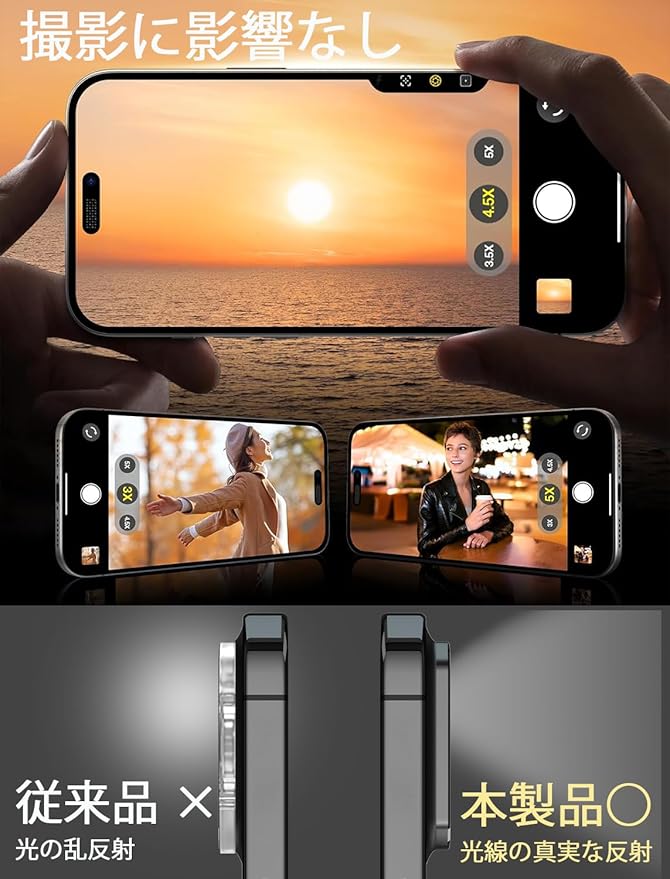 【撮影に影響なし】カメラレンズ部分に穴が開いている仕様でカメラ機能には全く影響しません。撮影時の露出オーバーを効果的に防止し、写真や動画の白飛びを防ぐことができ、カメラ機能には全く影響しません。いPhone17pro本来の撮影を楽しみたい方におススメです。