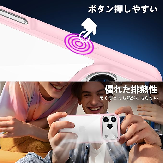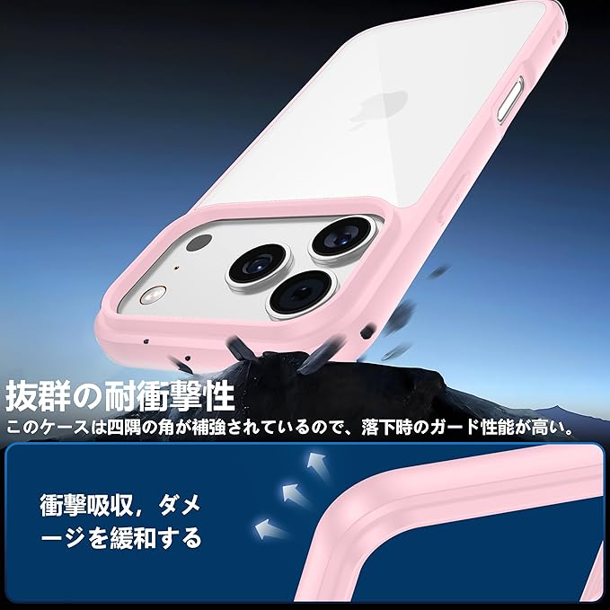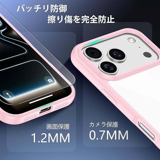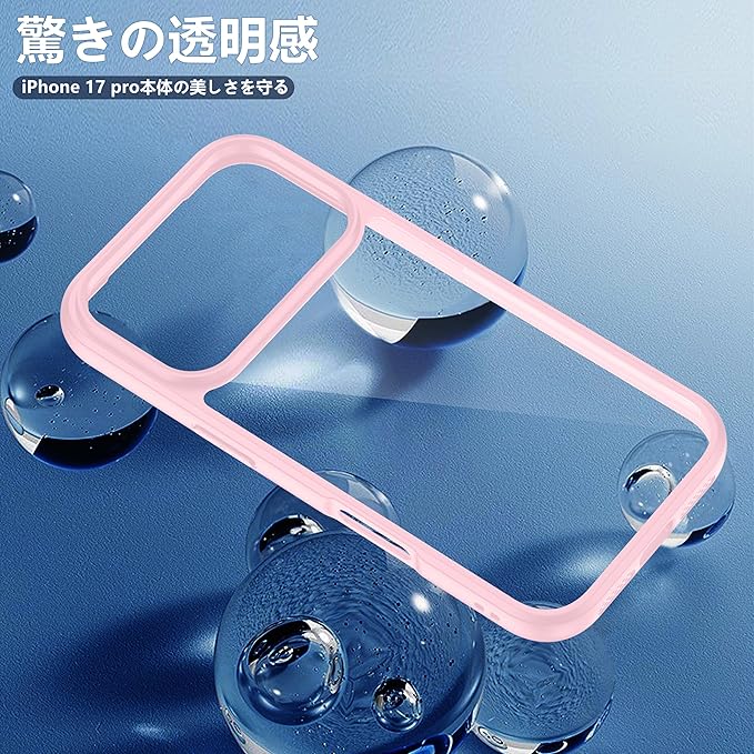 【驚きの透明度】透き通った高い透明度を誇り、iPhone 17pro本来の美しいデザインとカラーをそのままに楽しめます。黄変に強い素材を採用し、常に透明感を保ち、長時間使用しても黄色に変わりません。アイフォン17プロケースの背面は放熱性良いポリカーボネート素材で、熱を効果的に放散し、バッテリーにとても優しいです。