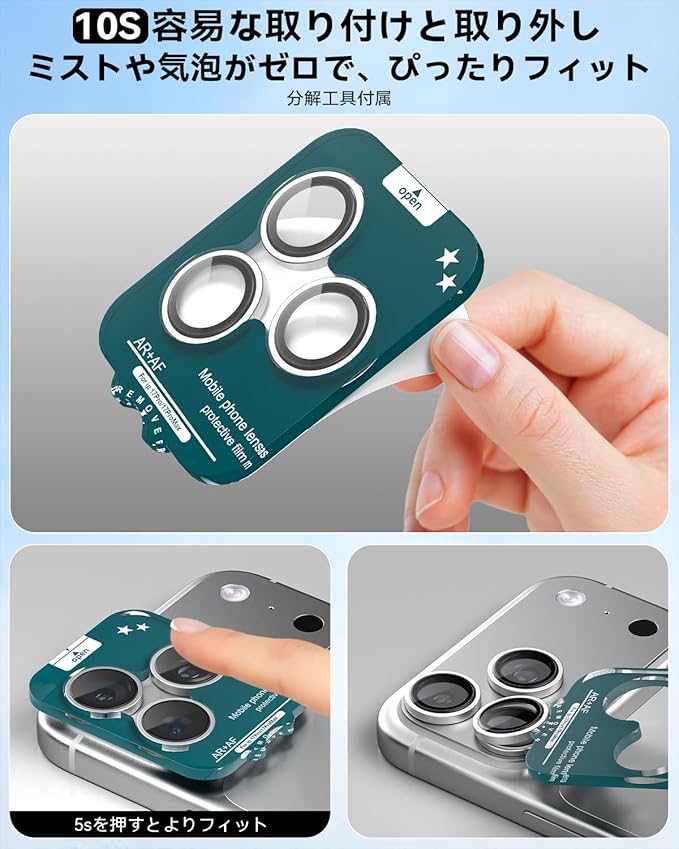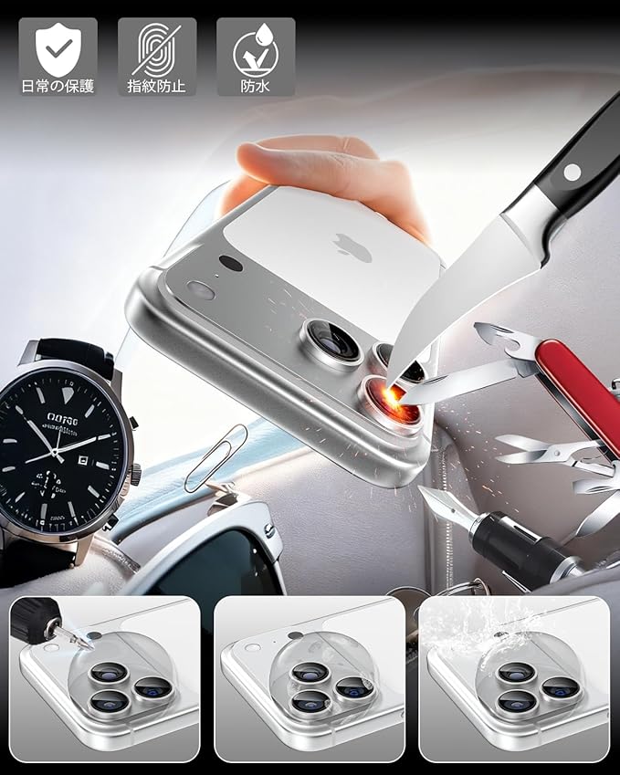 【卓越した落下&スクラッチ保護】硬度 9H の超強化ガラスと航空機級メタルリングを採用して製造されたこのレンズプロテクターは、硬い表面との接触があっても、スクラッチ、落下、割れを防ぎます。スタイリッシュさと同じくらい優れた強度を持つ、安心できる保護を享受できます。3 世代目オレオフォビックコーティング(撥油コーティング)により指紋や油分をはじき、カメラを一日中清潔で鮮明な状態に保ちます。