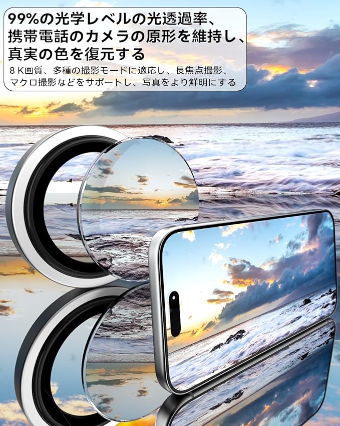 【AR+AF デュアルコーティング、リアルな色彩を再現】AR(反射防止)及び AF(撥水撥油 / 光学補正)のデュアルコーティング技術を採用し、グレア(逆光)問題を解決します。夜間にフラッシュを使用して撮影してもグレアが発生せず、撮影時の鮮明度と質感を大幅に向上させます。99% の光学級光線透過率を実現し、スマホカメラの本来の性能を維持しつつ、被写体のリアルな色彩を忠実に再現します。