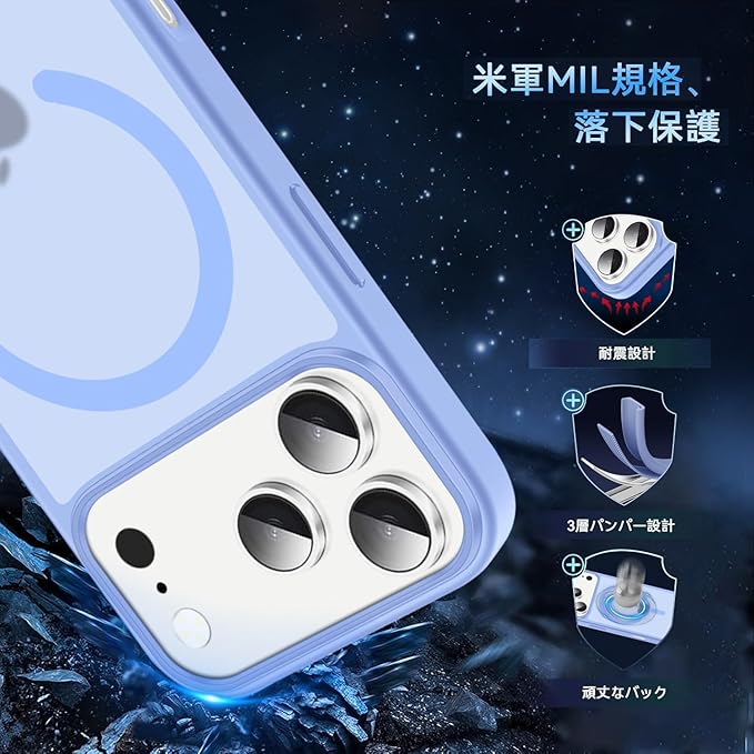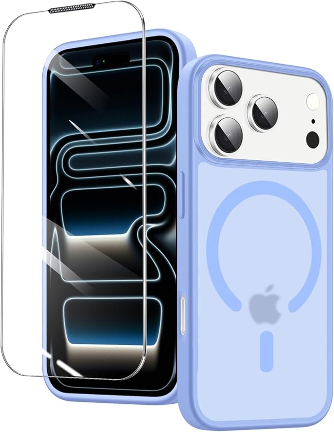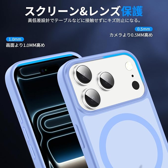 iPhone 17 Pro Max 用 ケース カバー 1枚ガラスフィルム付き 半透明 MagSafe対応 TPU+PC ワイヤレス充電対応 マグネット搭載 強化ガラス 耐衝撃 グーグル アイフォン17promax カバー 神秘的な肌感 自動吸着 高透過率 気泡ゼロ 指紋防止(ブルー)
