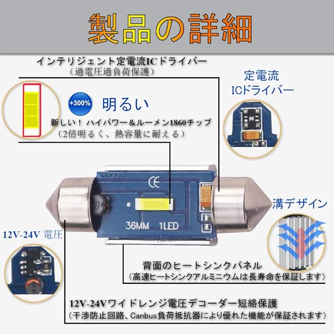 商品 スペック:36mm LEDバルブ;電圧:12V-24V;チップ:SMD1860;ベース:ホワイト 6000K;サイズ:全長 36mm、最大幅 8.5mm