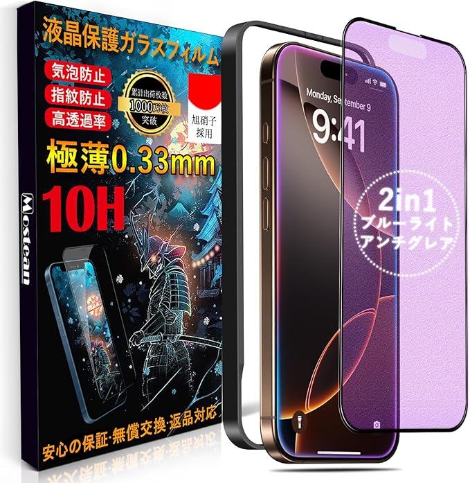 Mostean【アンチグレア + ブルーライトカット】対応 iPhone16 Pro/対応iPhone 17 ガラスフィルム ブルーライトカット アンチグレア 対応 いPhone16 Pro/いPhone17 保護フィルム 目の疲れ軽減 反射防 止指紋防止 貼り付け簡単 ガイド枠付き アイフォン16 Pro/アイフォン17 フィルム【 6.3インチ】