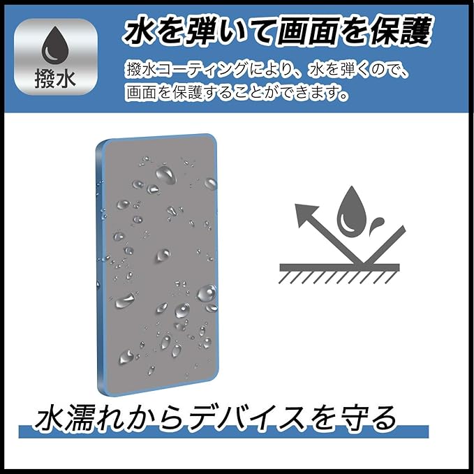 特殊な撥水コーティングが施されています。この撥水コーティングにより、水滴が画面に滞留せず、すばやく滑り落ちるため、デバイスの画面が水濡れから保護することができます。雨天時や水濡れからデバイスを守ります。