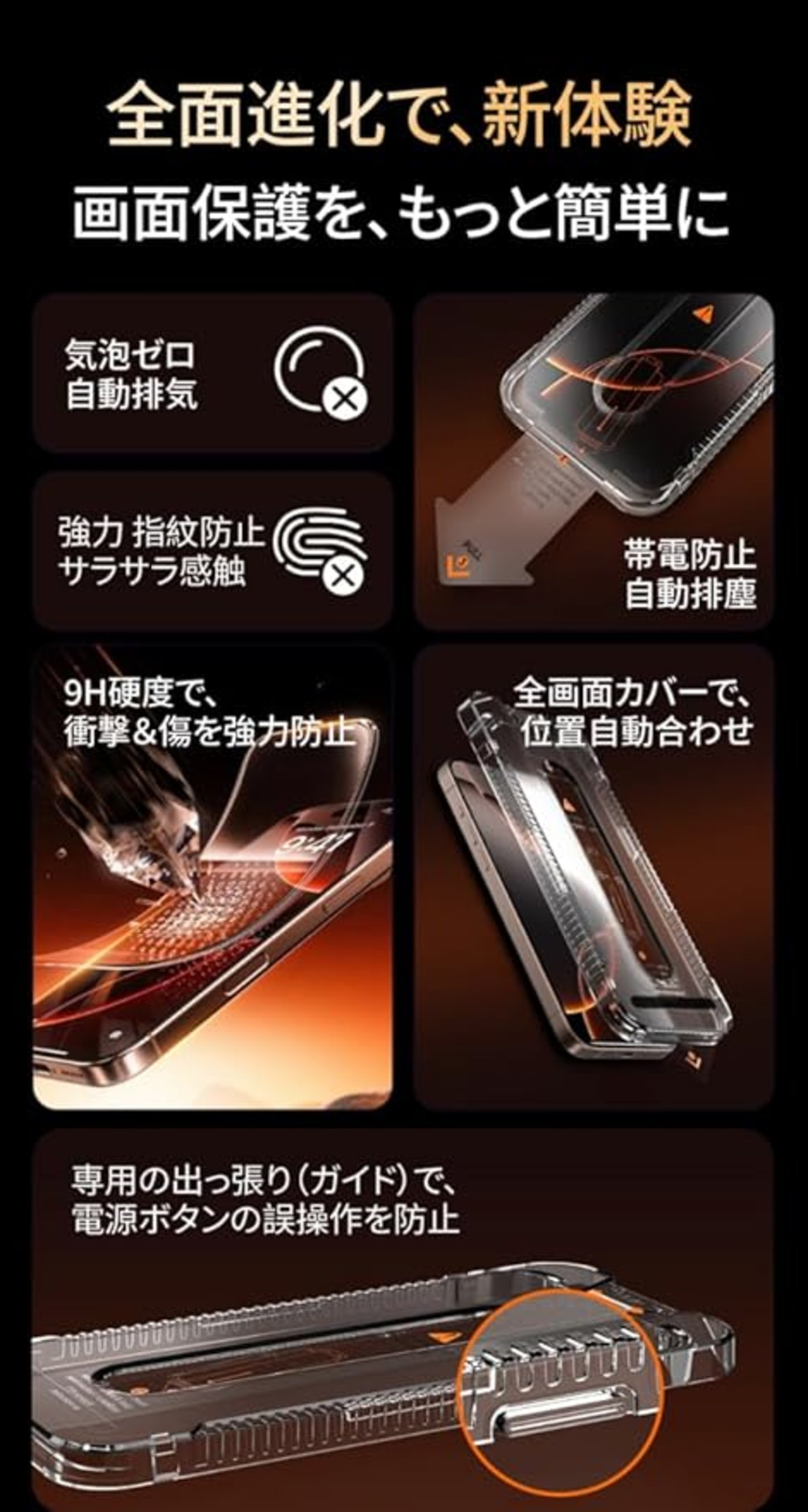特徴 9H 表面硬度, 自動吸着, 防指紋, 高精細な鮮明度