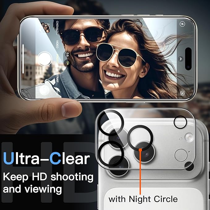 [クリアな撮影] 99%の光透過率を誇るカメラレンズプロテクターは、画像と動画の本来の画質を忠実に再現します。フラッシュの干渉も防ぎ、暗い場所でも美しい写真を撮影できます