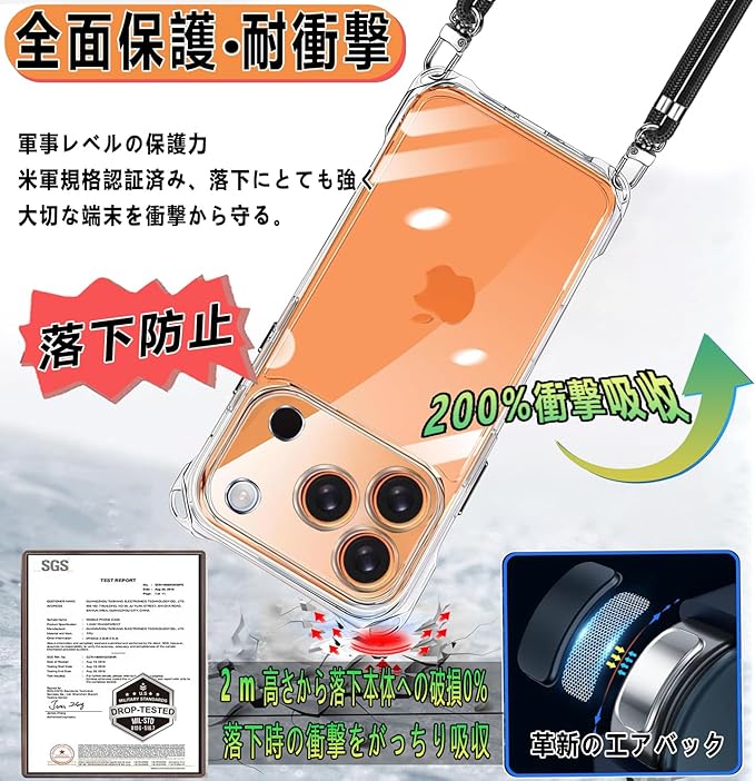【耐衝撃 & 米軍MIL規格の取得】その耐衝撃性能は第三者機関の試験による米軍MIL規格をクリアするほど高いことが証明されております。iPhone 17 Proケースの四隅部分に"衝撃吸収テクノロジー"を採用し、これにより角からの衝撃を受けてもその隙間がクッションの様に本体への衝撃を吸収します。万が一スマホを落としてしまった場合でも、落下時のダメージを最小限に抑えることが可能となっており。