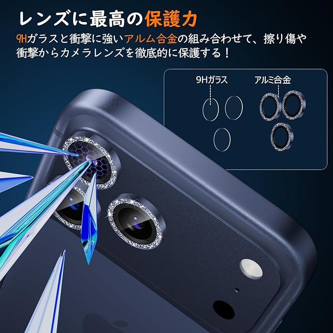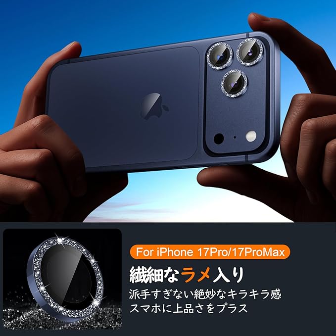 レンズカバー iPhone17 Pro/17 Pro Max用 カメラフィルム キラキラ 9H強化ガラス アルミ合金 耐衝撃 いphone17pro/17pro max カメラ保護 高透過率 キズ防止 露出オーバー防止 全面保護 気泡ゼロ 指紋防止 貼り付け簡単 アイフォン17プロ/17プロマックス 対応 独立型レンズプロテクター (17Pro/Max,ディープブルー)